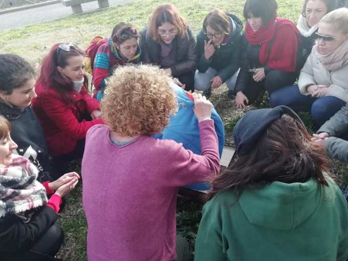 Le attività didattiche possono essere fatte in maniera ludica anche fuori, all’ aria. Permette di disintossicarsi, di camminare. Di vedere altre cose. Ci sono giochi come le visualizzazioni in contatto con gli altri posando le teste sulle pance. Si possono fare le capanne con le corde e i teli, per raccontarci storie o filastrocche. Ci si può mettere in cerchio battere le mani e fare su e giù. Possiamo bendarci e dirigerci con gli altri sensi verso il pifferaio che suona per noi….Tutto questo all’ aria aperta.