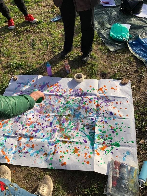 Lasciare il segno ieri ed oggi per me, è stato riparatore. Sono andata oltre le mie resistenze. Ho attraversato con la tempera gli specchi. Di varie corde colorate abbiamo creato un bambino, non abbiamo cercato di strozzarlo. Con la benda sugli occhi al buio, mi sono messa una mano sul cuore, per dipingere al ritmo di una musica tribale, il mio sentire. Ho camminato ad occhi chiusi mentre la mia collega di corso mi faceva sentire il fruscio dell’ acqua della fontanella. Dopo aprendo gli occhi e vedendola mi sono accorta, come una bimba che, mi scappava la pipì. 😉 Ho amato sognare gli Smarties colorati quando ognuna di noi faceva sgocciolare le tempere su un foglio in plenaria.